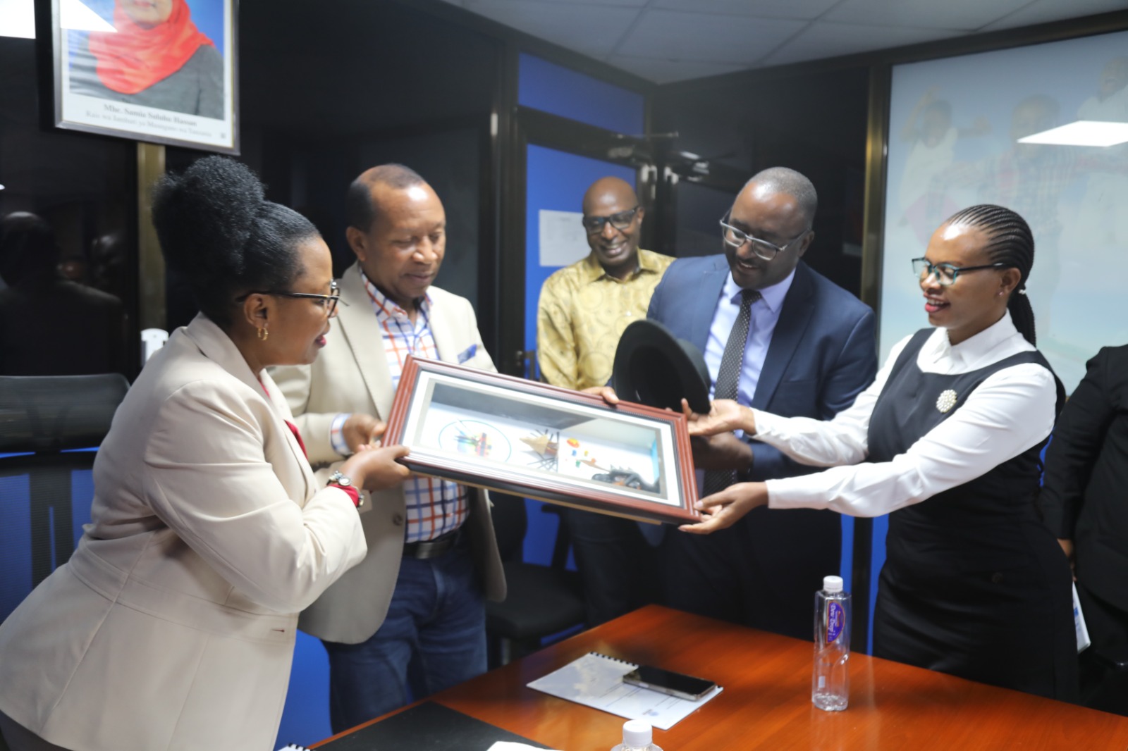 Watumishi wa Ofisi ya Mkoa wa Arusha wakikabidhi zawadi kwa viongozi wa Bodi ya Wakurugenzi wakiwa kwenye ziara ya kikazi mkoani Arusha tarehe 14 Aprili, 2026.