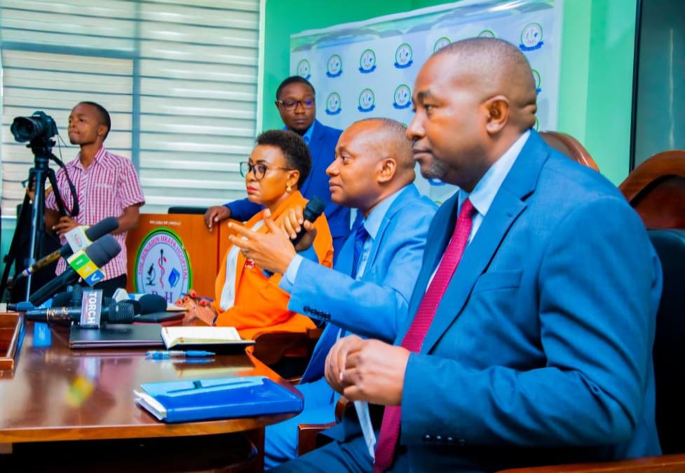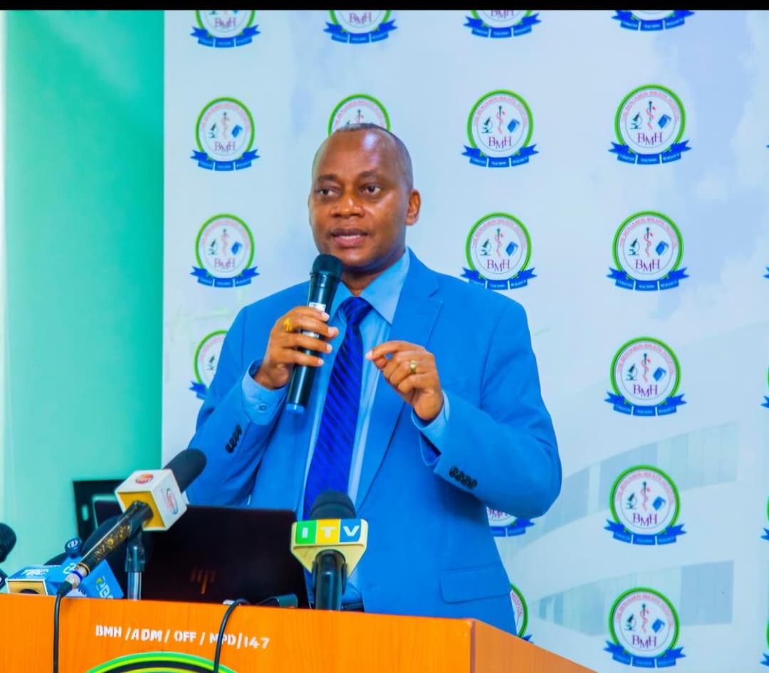 Mkurugenzi mtendaji wa Hospitali ya Kanda ya Benjamini Mkpaka akizungumza na vyombo vya habari katika mkutano wa vyombo vya habari wa maandalizi ya harambee ya kuchangia gharama za kupandikiza uloto