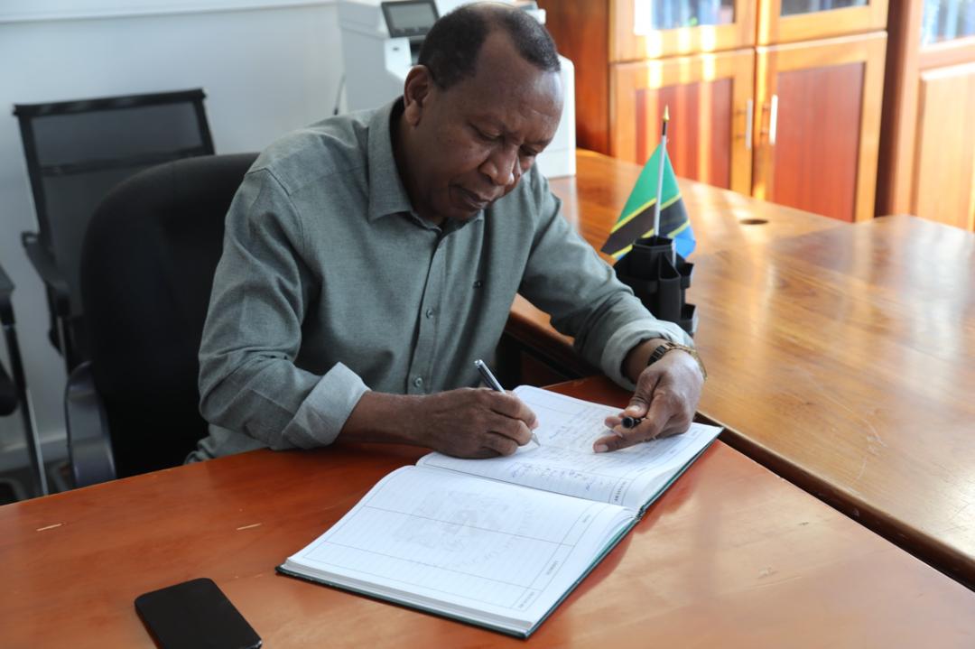 Mwenyekiti wa Bodi ya Wakurugenzi ya NHIF, Bw.Eliud Sanga akisaini kitabu cha Wageni akiwa mkoani Singida katika ziara ya kikazi.
